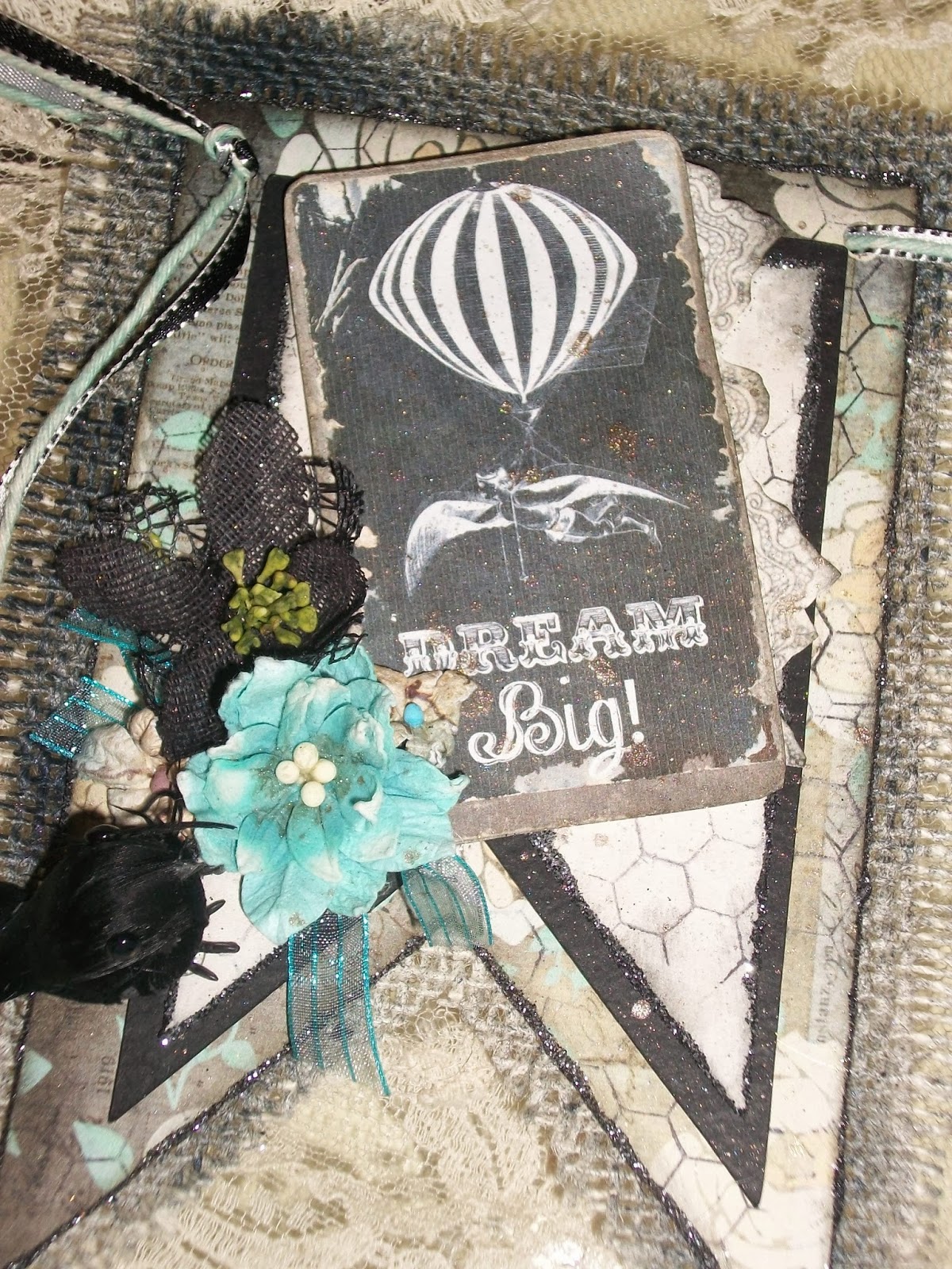 I started with the beautiful Nirvana Collection cut out little banners, backed them on chipboard.